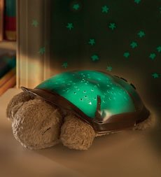 Twilight Turtle. One look at this adorable plush turtle's gently drooping eyelids should be enough to encourage kids to drift off to sleep. But the sandman's sure to show up when a starry night sky shines onto the ceiling from within this talented turtle's plastic shell. The 8 major constellations mentioned in the included illustrated star guide are fun for parents and children to trace together; the thoughtful terrapin offers 3 different levels of brightness and comes with 3 AAA batteries. So soothing for ages 3 and up. Readmore .. .